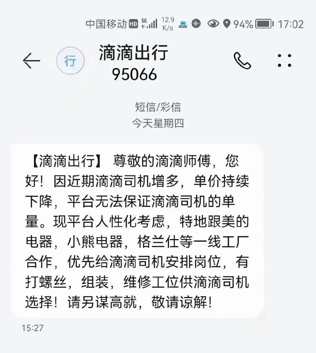 该截图显示,“因近期滴滴司机增多,单价持续下降,平台无法保证滴滴司机的单量。现平台人性化考虑,特地跟美的电器,小熊电器,格兰仕等一线工厂合作,优先给滴滴司机安排岗位,有打螺丝,组装,维修工位供滴滴司机选择!请另谋高就,敬请谅解!”