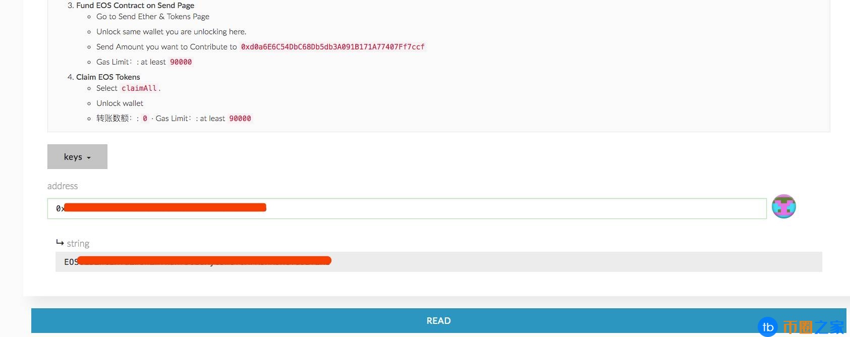 这个时候大家都知道胖哥是怎么想的了,就是我有没有成功,有没有填多,有没有可以验证。很简单。在刚才的下拉框中选择‘keys’,然后在输入框中输入你的以太坊地址,点击‘Read’。你刚才绑定的EOS公钥就会出现。检查一下,很实用。