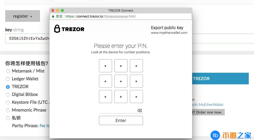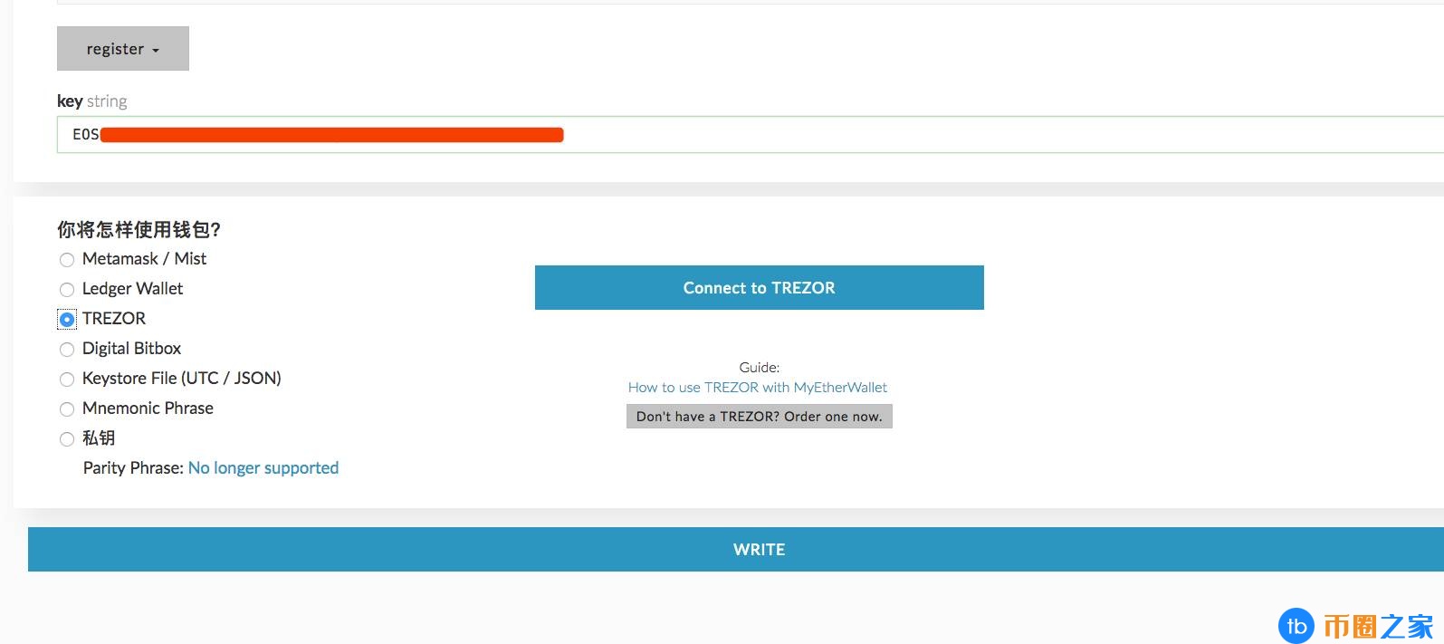 这时候会出来一个输入框,填写刚刚获得的EOS公钥。trezor用户选择trezor连接并解锁钱包(详情请参考同时推送的另一个教程)。其他用户可以输入密钥库或私钥或其他方式连接eth钱包。
