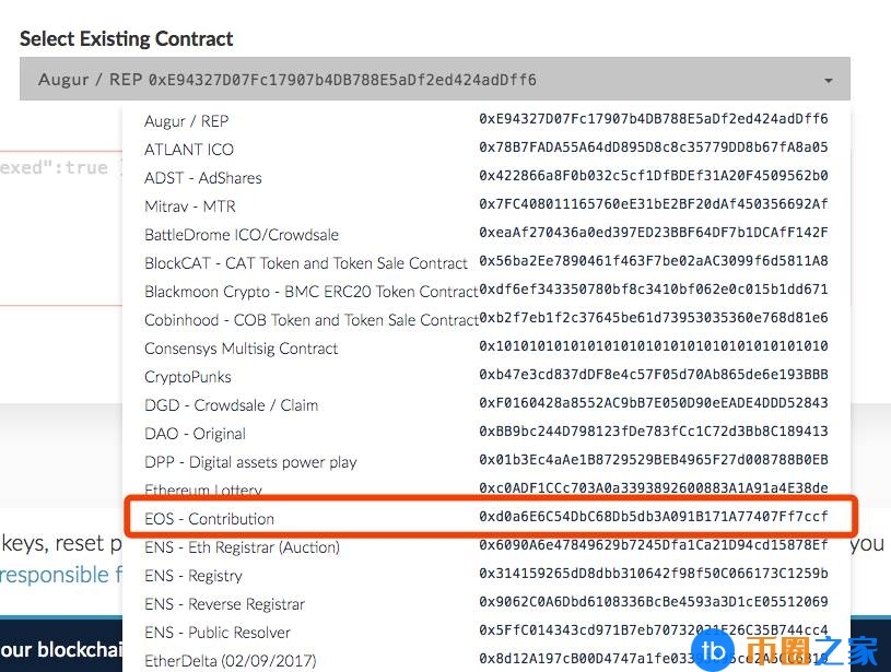 首先,登录https://www.myetherwallet.com/#contracts,在下拉框中选择EOS。
