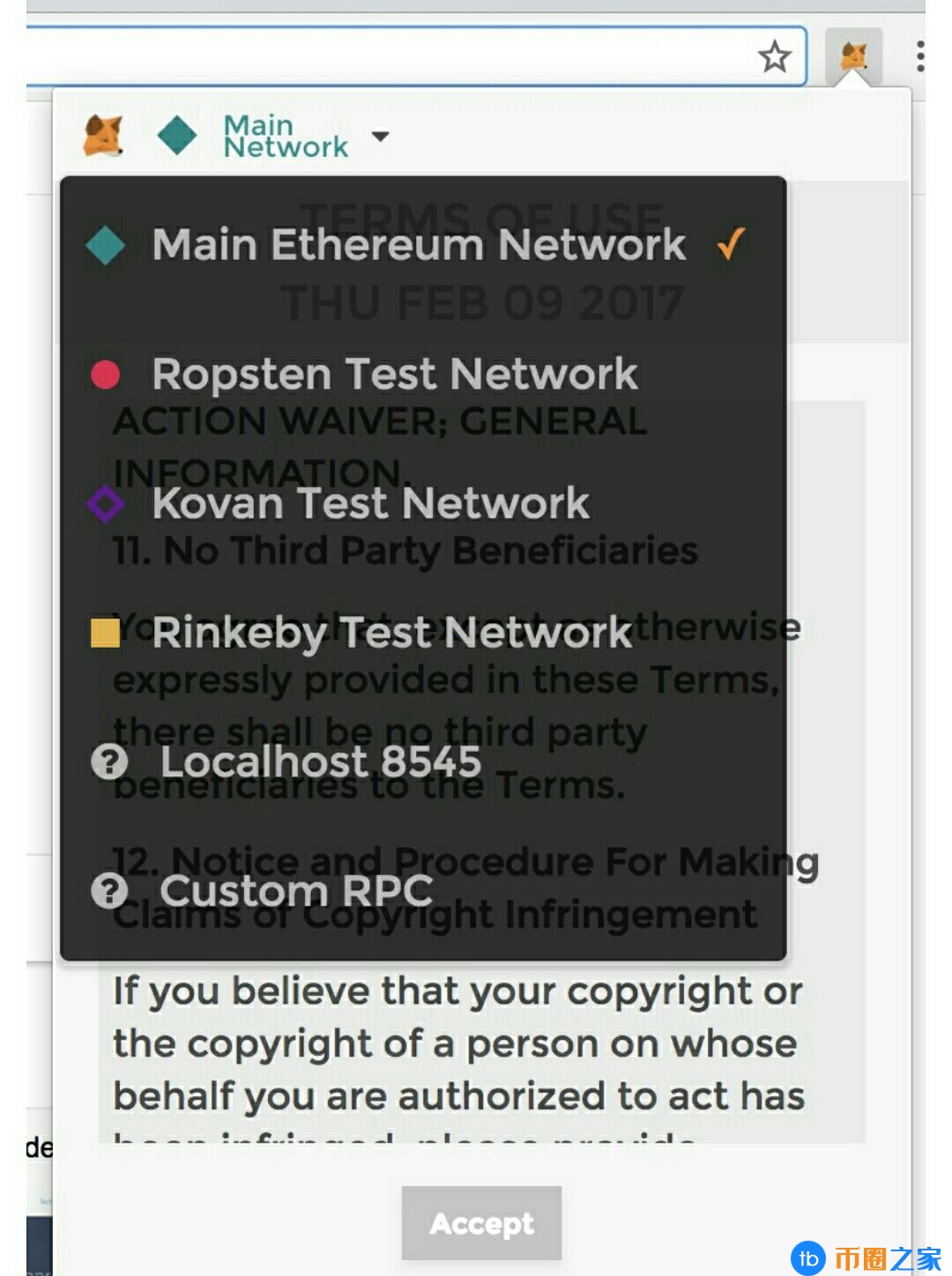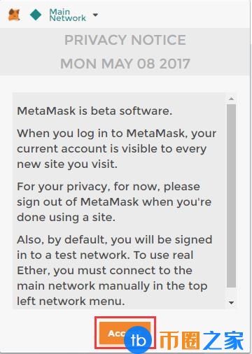 点击小狐狸的图标,会弹出一个隐私提示框,点击Accept接受点击Fox的图标,会弹出一个隐私提示框。单击接受以接受它。