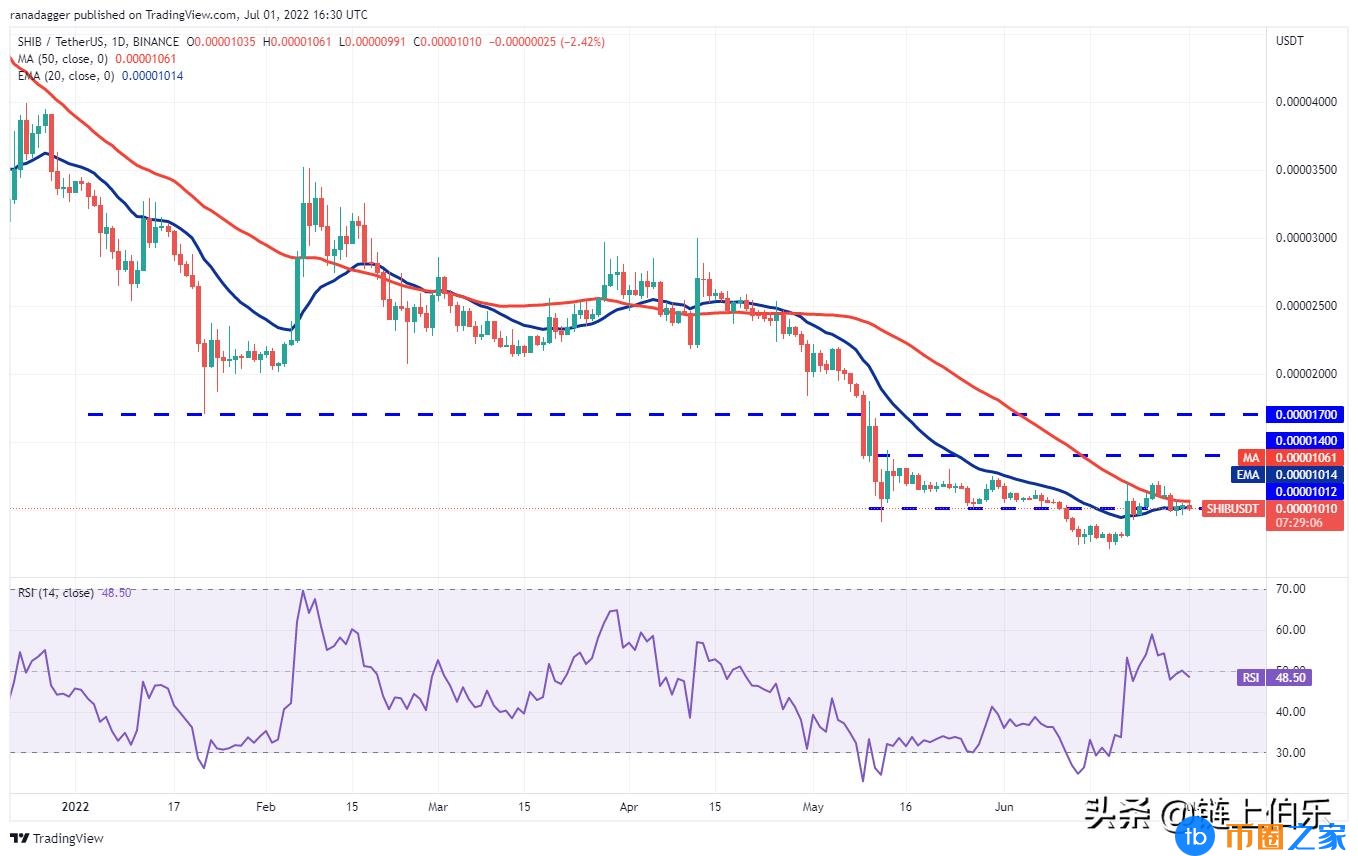 柴犬(Shiba月28日收盘跌破0.000010美元,但空头部可能维持低位。逢低买入,但试图将价格推至50天移动平均线以上(0.000010美元)