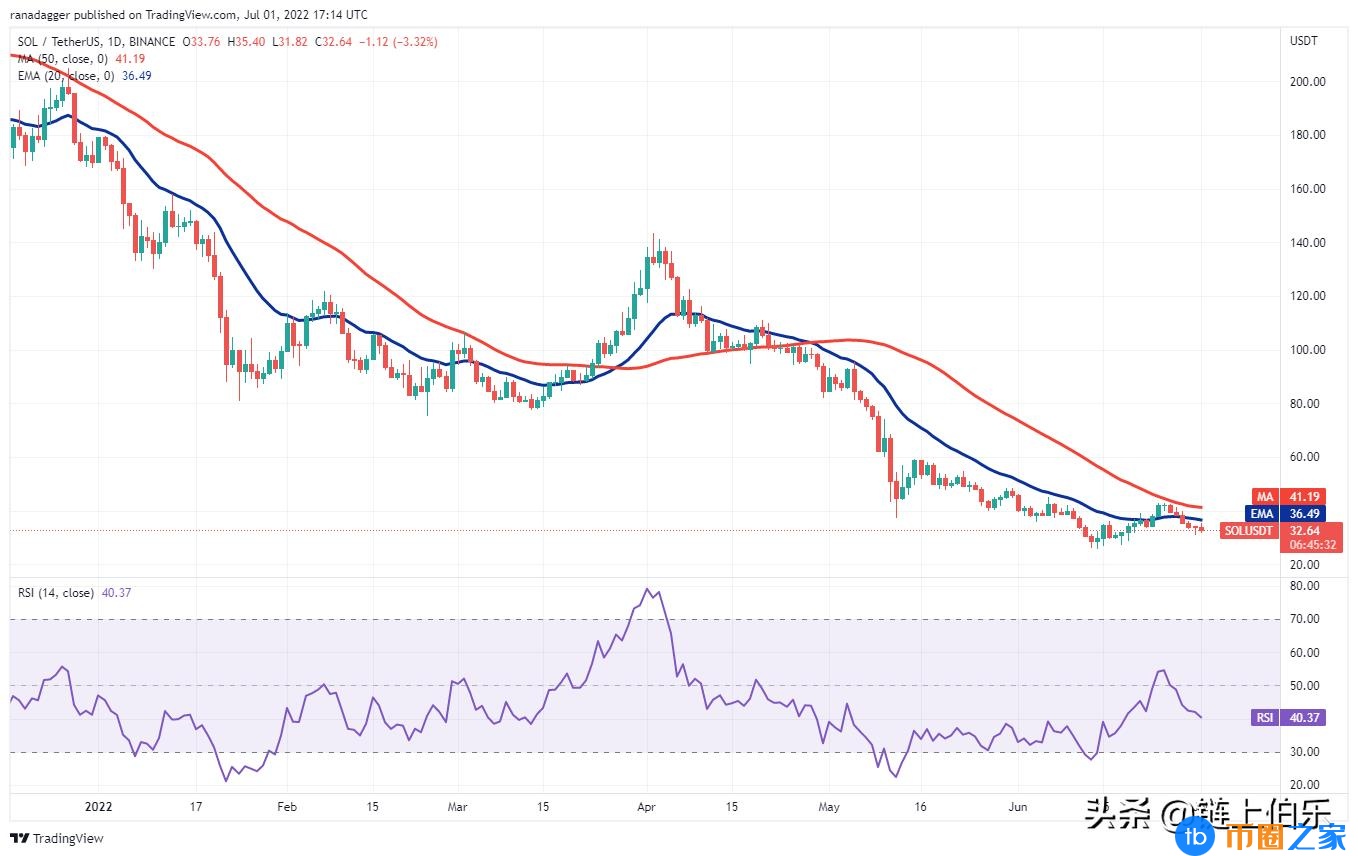 Solana (SOL)在6月30日跌破了33美元的直接支撑位,但是烛台上的长尾理论显示了低水平的强劲买盘。买方试图在7月1日将价格推至20天移动平均线(36美元)上方,但空没有松口。