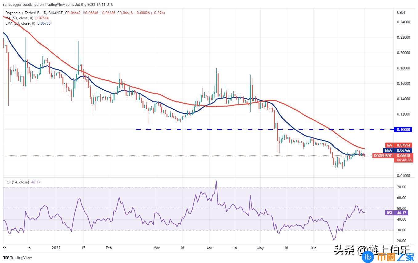 Dogecoin见证了20日均线(0.07美元)附近多头与空多头的一场硬仗。RSI略低于中点,均线20天走平,说明卖方优势不大。