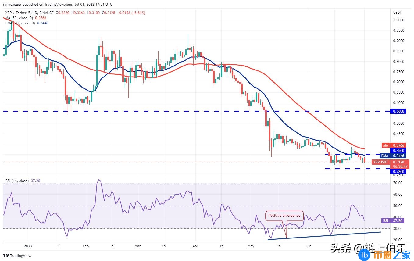 瑞博(XRP)在6月30日试图反弹,但多头无法将价格推高至0.35美元的上方阻力位。这说明空领导不愿意放弃自己的优势。