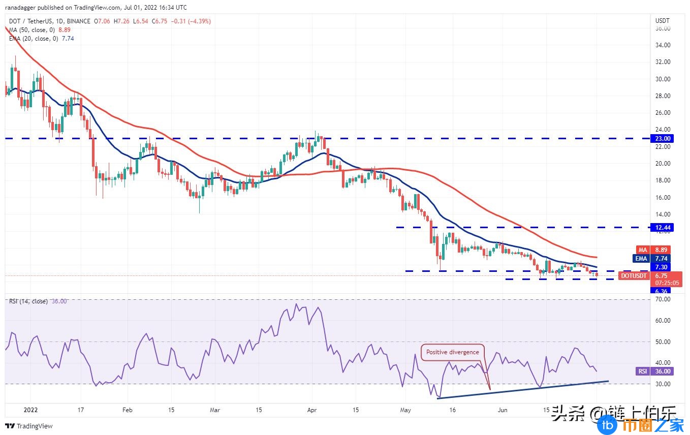 Polkadot (DOT)于6月29日跌破7.30美元的强支撑位。买方试图将价格推回到6月30日的水平以上,但没有成功。说明空头在每一次小反弹中都在卖出。