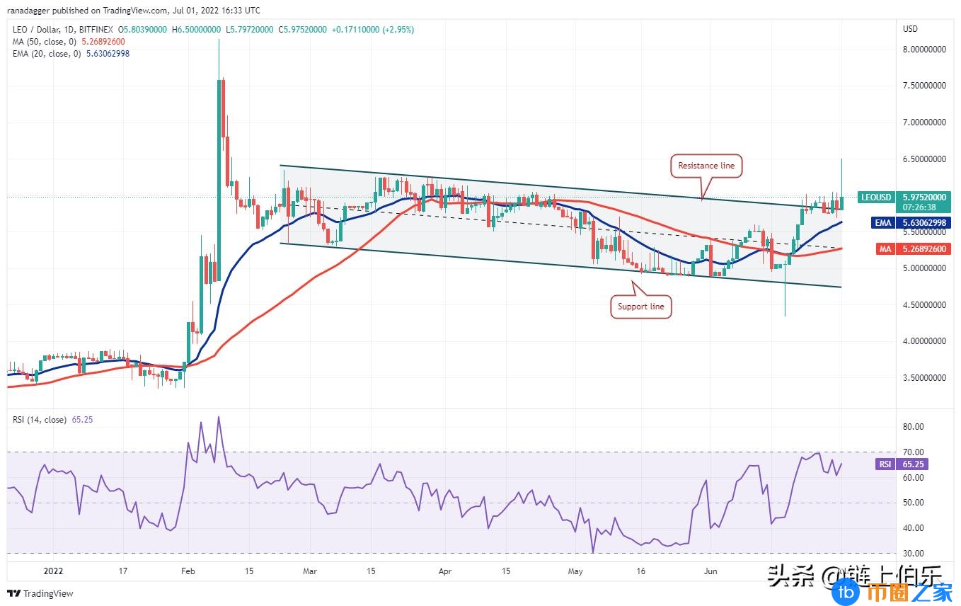 从通道的突破开始,表明一个新的上升趋势。买家在7月1日将价格推高至6.50美元,但烛台上的长灯芯表明空头正在销售高峰。如果多头将价格保持在6.00美元上方,利奥/美元对可能会再次升至6.50美元。如果这个水平被清除,反弹可能会扩大到6.90美元的模型目标。