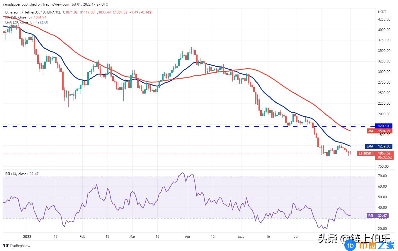 以太坊(ETH)6月30日跌破1050美元直接支撑位,但多头买入跌势。买方试图在7月1日延长复苏,但烛台上的长灯芯表明空头在小幅反弹中卖出。