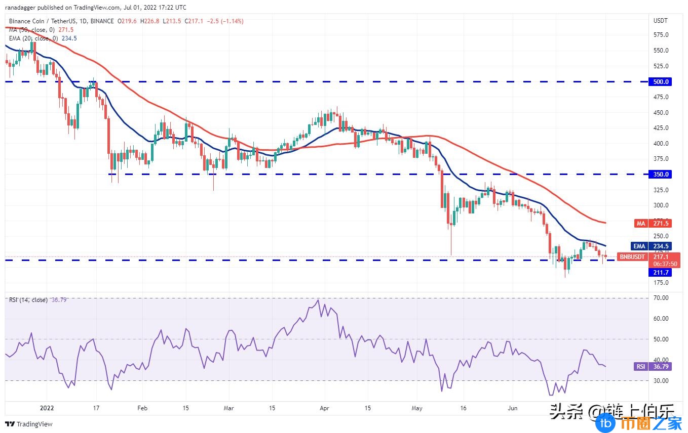 6月30日,BNB跌破211美元的强支撑位,但从当天蜡烛线的长尾理论来看,更低的支撑位吸引了强劲的买盘。