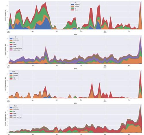 请注意,在 2022 年 5 月,在 LUNA 稳定币崩盘时,大约 10B 美元的 usdt 被赎回。其中,大约 5B 美元是「usdt 去风险」,做市商将 usdt 换成 USDC。