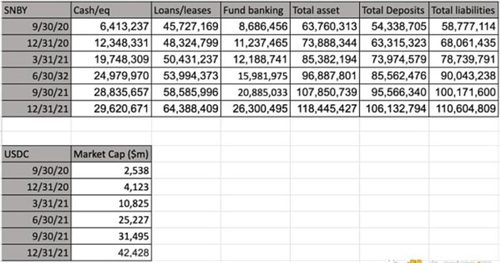 因为 SI 和 SBNY 是上市公司,我们可以在他们各自的 SEC 备案文件 (SI, SBNY) 中跟踪他们每个季度的资产负债表。500 亿美元是一大笔钱,即使对银行来说也是一大笔钱,因此我们可以跟踪 USDC 增长带来的资产负债表变化。将 USDC 与资产负债表相关联,我们看到,在 2021 年的增长期间,USDC 大部分在 SBNY 银行: