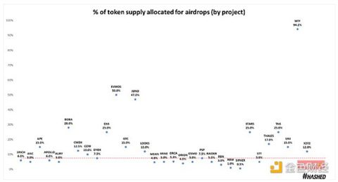 首先,让我们看看每个项目分配给空投的代币供应百分比的分布: