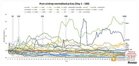 到 100 天,空投的平均价格为 0.64(从第 1 天起贬值 -36%),74% 的交易价格低于启动价格
