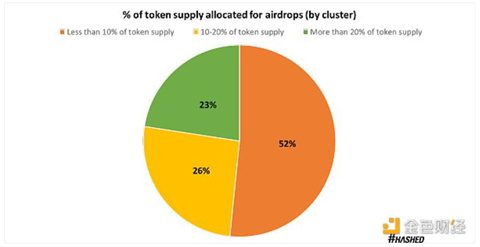 大多数项目分配的代币供应量低于 10% 用于空投,其次是 26% 的项目在 10-20% 的范围内,23% 的项目在 >20% 的范围内。