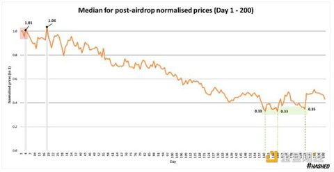 根据历史中值数据,在 200 天的时间范围内,只有两天的空投中值表现优于发布价格——第 4 天( 1%)和第 18 天( 4%)。