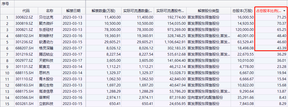 需要注意的是,相较于市值规模,解禁比例往往更能影响个股股价的走势。下周将有6家公司解禁比例占总股本比例超过40%。