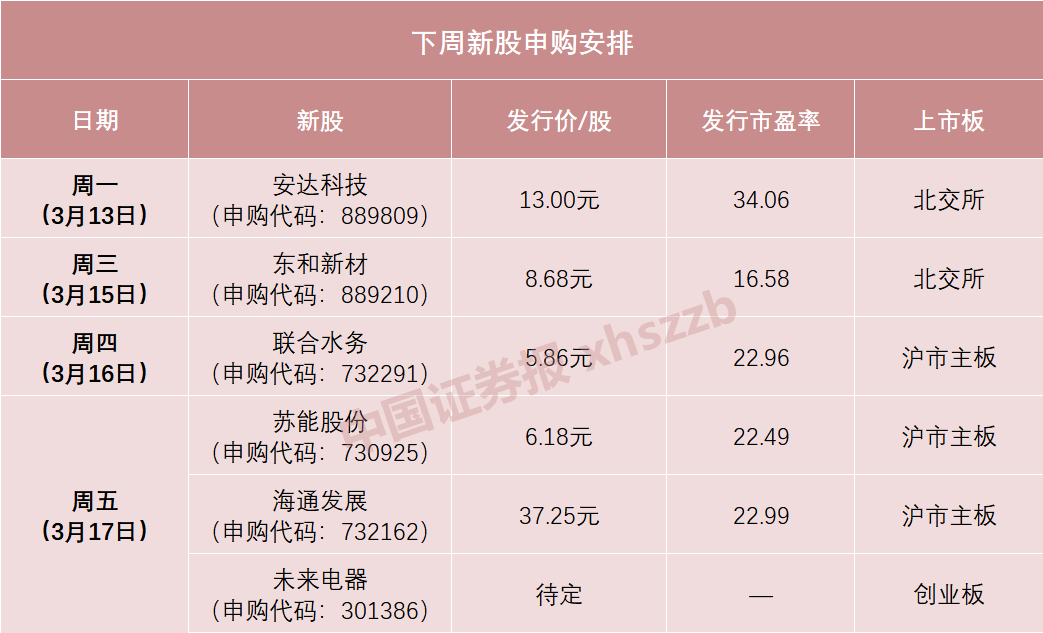 根据新股发行安排,下周有6只新股申购,包括沪市主板新股3只、创业板新股1只、北交所新股2只。