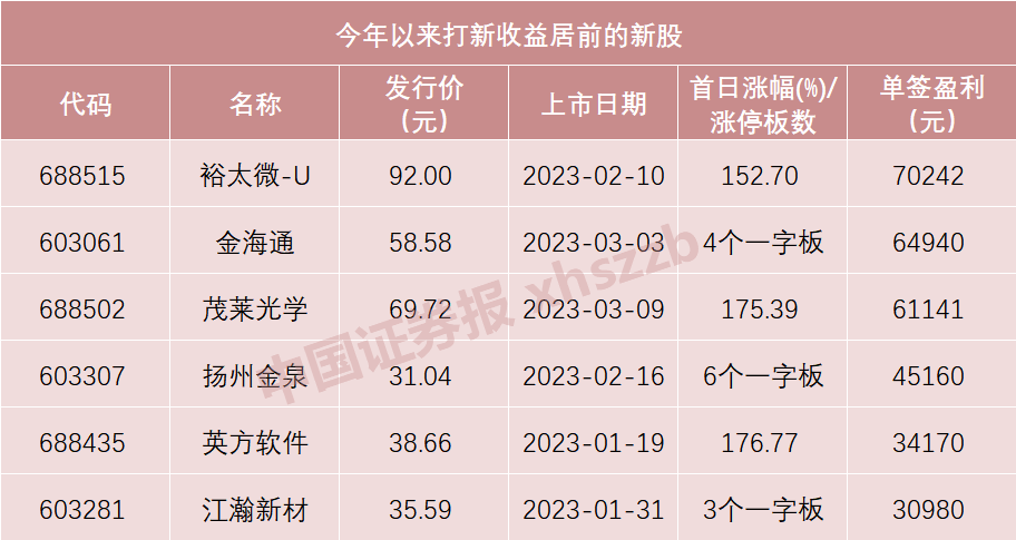 今年以来,新股市场回暖,赚钱效应回升。在今年以来上市的新股中,有6只新股的单签收益超过3万元。裕太微-U排名第一,上市当日中一签最多可赚8.8万元,按收盘价计算中一签可赚7.02万元。金海通、茂莱光学分别以6.49万元、6.11万元的单签收益,排在第二位和第三位。
