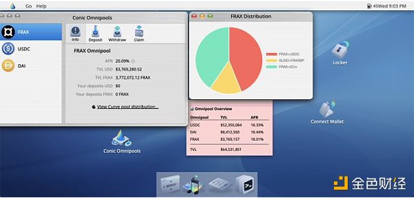 Conic 在 Curve 上提供 omnipools(将用户的流动性分散到不同的池子里,并将其质押在 Convex 上)。用户赚取 CRV CVX CNC