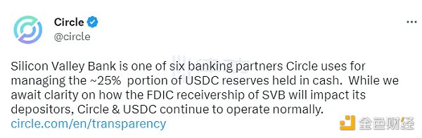 稳定币发行商 Circle 今日在社交媒体上发文表示,硅谷银行是 Circle 的六家银行合作伙伴之一,负责与其他银行共同管理 USDC 约 25% 的现金储备。Circle 目前正在等待观察美国联邦存款保险公司接管硅谷银行对其储户的影响,但 Circle 和 USDC 继续正常运营。