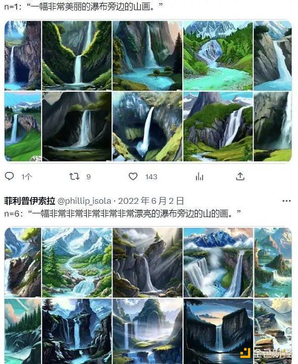 在 AI 这个不可捉摸的「黑箱」里,还可能有着不为人所知的潜规则,就连研究人员也无法弄明白。 比如在用 AI 制图时,各种单词可能有不同的权重,但这个也要不断试验才能知道。 先来猜一猜,「一幅非常漂亮的画,山旁有瀑布」和「一幅非常非常非常非常漂亮的画,山旁有瀑布」这两个提示,哪个用 DALL-E 2 输出的结果会更好?