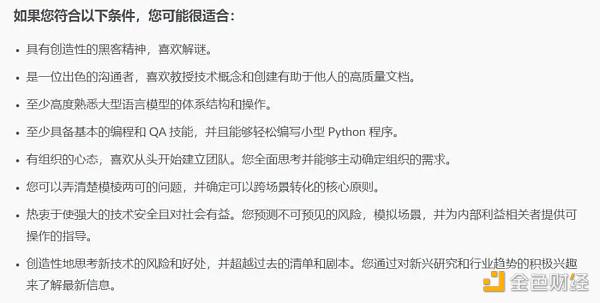 自由职业者工作平台 Upwork 开出每小时 40 美元的薪酬,请提示工程师生成博客文章和常见问题解答等网站内容。 看似和 AI 八竿子打不着的波士顿儿童医院,也打算招募 AI 提示工程师,负责编写分析医疗保健数据的脚本,白纸黑字征集跨学科人才: 理想的候选人应具有人工智能 / 机器学习、数据科学和自然语言处理方面的深厚背景,以及医疗保健研究和运营方面的经验。 由前 OpenAI 员工联合创立、被 Google 投资的 AI 初创企业 Anthropic,最近也在旧金山招募提示工程师,年薪高达 17.5 万到 33.5 万美元,换算成人民币就是百万年薪,这一岗位负责的主要内容是: 找出提示我们的 AI 完成各种任务的最佳方法,然后记录这些方法,构建一个工具库和一组教程,使其他人可以学习提示工程或简单地找到理想的提示词。 具体要求如下,其中硬性要求有 2 项:了解大型语言模型的架构、掌握基本的编程技能。