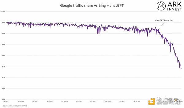 2月8日,微软宣布ChatGPT整合进必应后,谷歌的使用率跌惨了