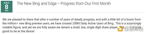 博文地址:https://blogs.bing.com/search/march_2023/The-New-Bing-and-Edge-–-Momentum-from-Our-First-Month/