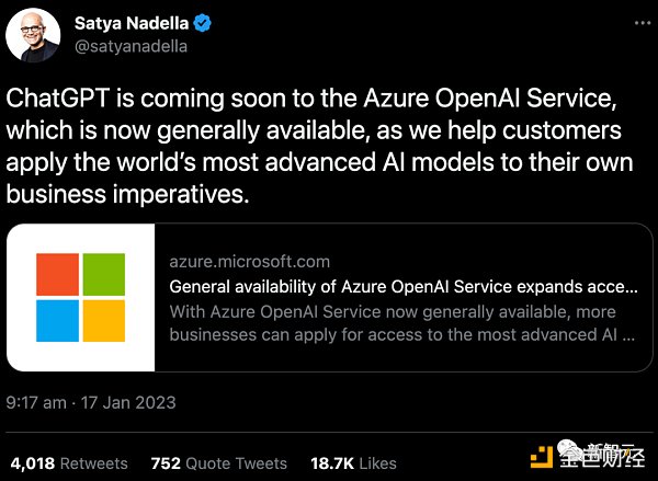 今年1月中旬,纳德拉就曾预告,微软即将在Azure中整合进ChatGPT。