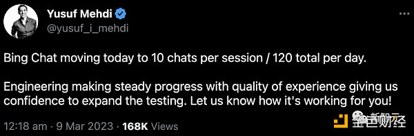 顺便,微软再再再次放宽了ChatGPT版必应聊天限制——每天120轮对话,每轮10句。