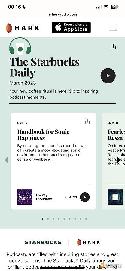 除了Odyssey之外,Starbucks 还做了一件有趣的事,和播客策展平台 Hark Audio 联合推出了名为 The Starbucks Daily 的播客(内置在星巴克App中)。通过每天 2-6 分钟的音频精选,提升用户喝咖啡时的体验,另外 CMO 称还会为会员提供特别活动,比如新帝国大厦的开幕式。
