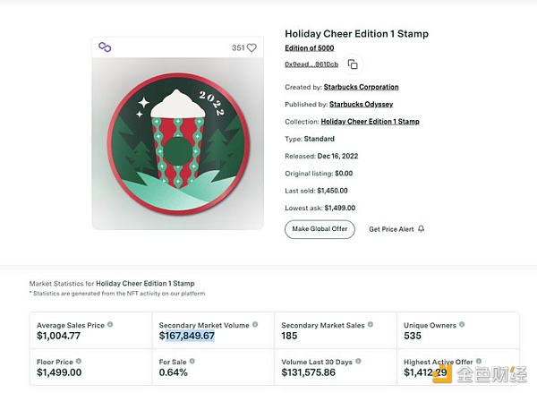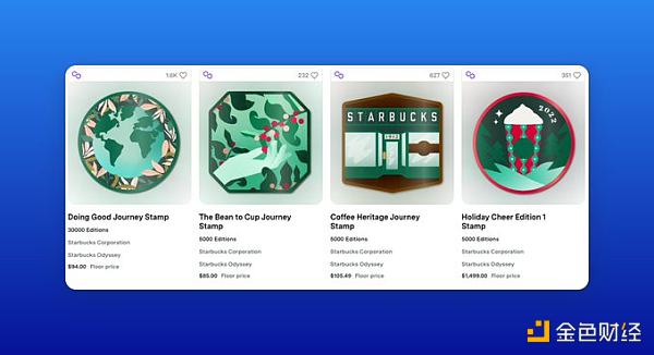 Odyssey 自从去年 12 月开启内测,到目前已经发布了 4 个 Journey, 对应 4 个 Stamps(NFT),已经产生了$218k 的二级市场交易量。这 4 个 Stamps 都是完成任务后用积分免费兑换,也就是说最初的 holder 都实现了 participate-to-earnholiday season。(相关阅读:《星巴克进军 web3,标志着 NFT 行业下一个里程碑》)