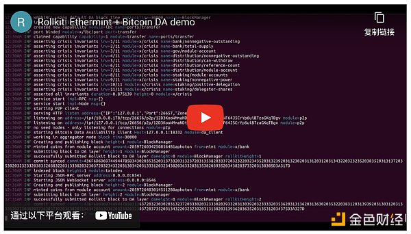 Rollkit 支持自定义执行层,包括 EVM、CosmWasm 或 Cosmos SDK。为了测试集成,Rollkit 在本地比特币测试网络上运行 EVM(使用了 Ethermint) 作为主权 Rollup。请参见下面的演示。