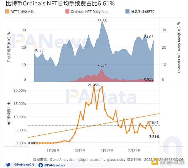从 OrdinalsNFT 手续费占当日总手续费的比重来看,统计期内的平均值约为 6.61% ,即矿工收入的近 7% 来自 NFT 活动。不过这只是日均值,受到早期 NFT 活动较少的影响较大,如果把观察的时间范围缩小至 2 月份,那么矿工收入的近 9% 都来自 NFT 活动。