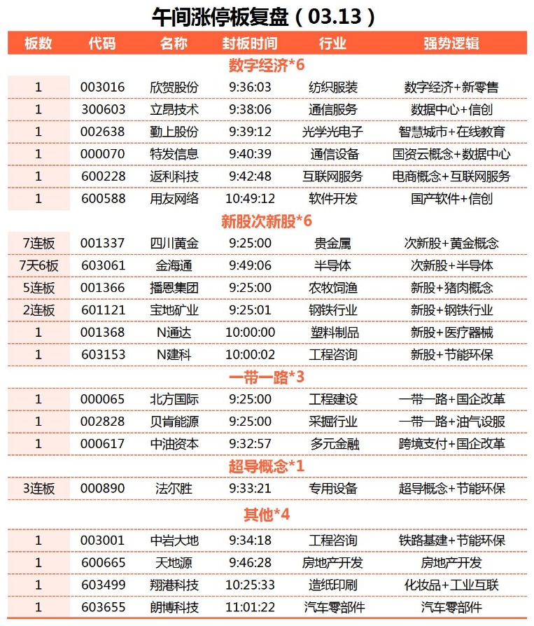 板块方面,数字经济概念继续活跃,立昂技术20CM涨停,用友软件、特发信息涨停,新国都、中望软件涨超10%;一带一路开盘拉升,北方国际、贝肯能源一字涨停,中油资本涨停;贵金属板块早盘强势,盛达资源大涨8%,紫金矿业、银泰黄金、西部黄金涨超5%;下跌方面,汽车产业链继续走弱,银宝山新跌停,中汽股份大跌7%。
