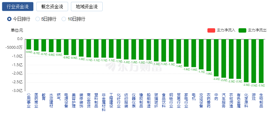 净流出方面,生物制品、游戏等净流出排名靠前,其中生物制品净流出2.5亿元。