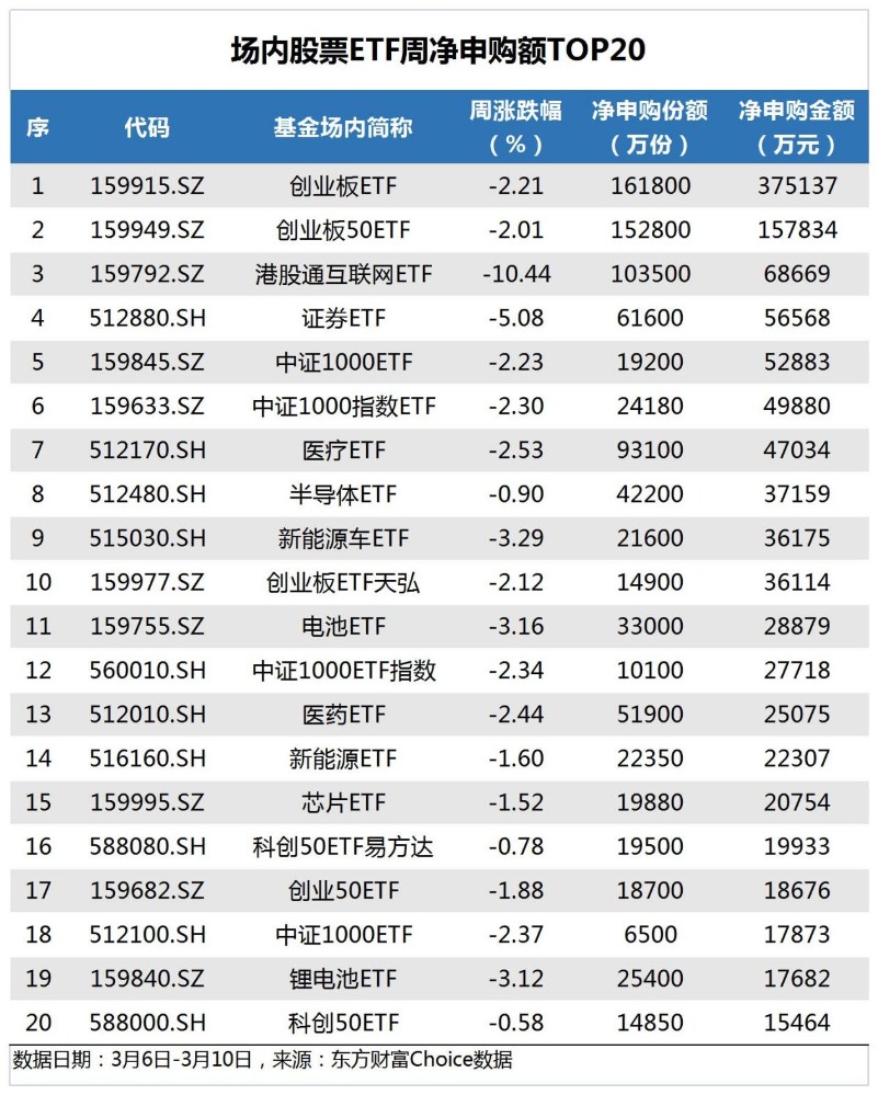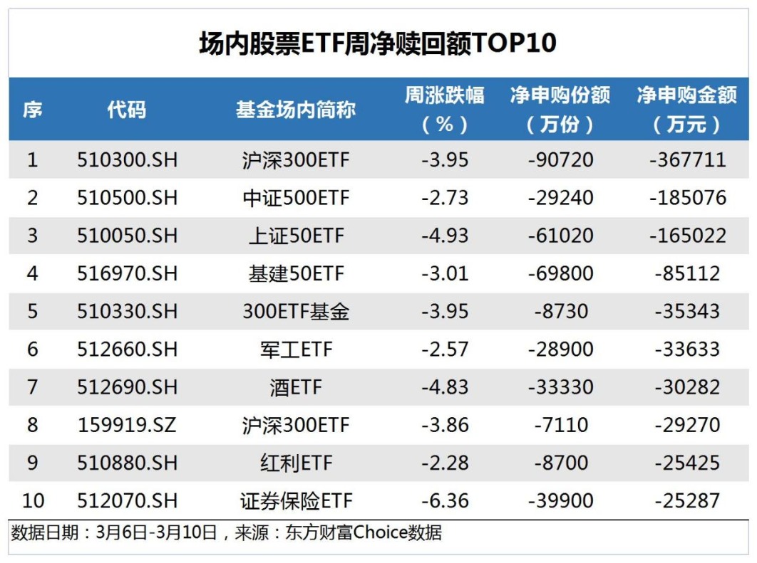 导读上周(3月6日-3月10日),A股三大指数集体下跌,其中沪指累跌2.95%,深成指累跌3.45%,创业板指累跌2.15%。理财笔记Choice数据显示,当周场内股票型ETF净申购65.82亿份。其中,沪市股票型