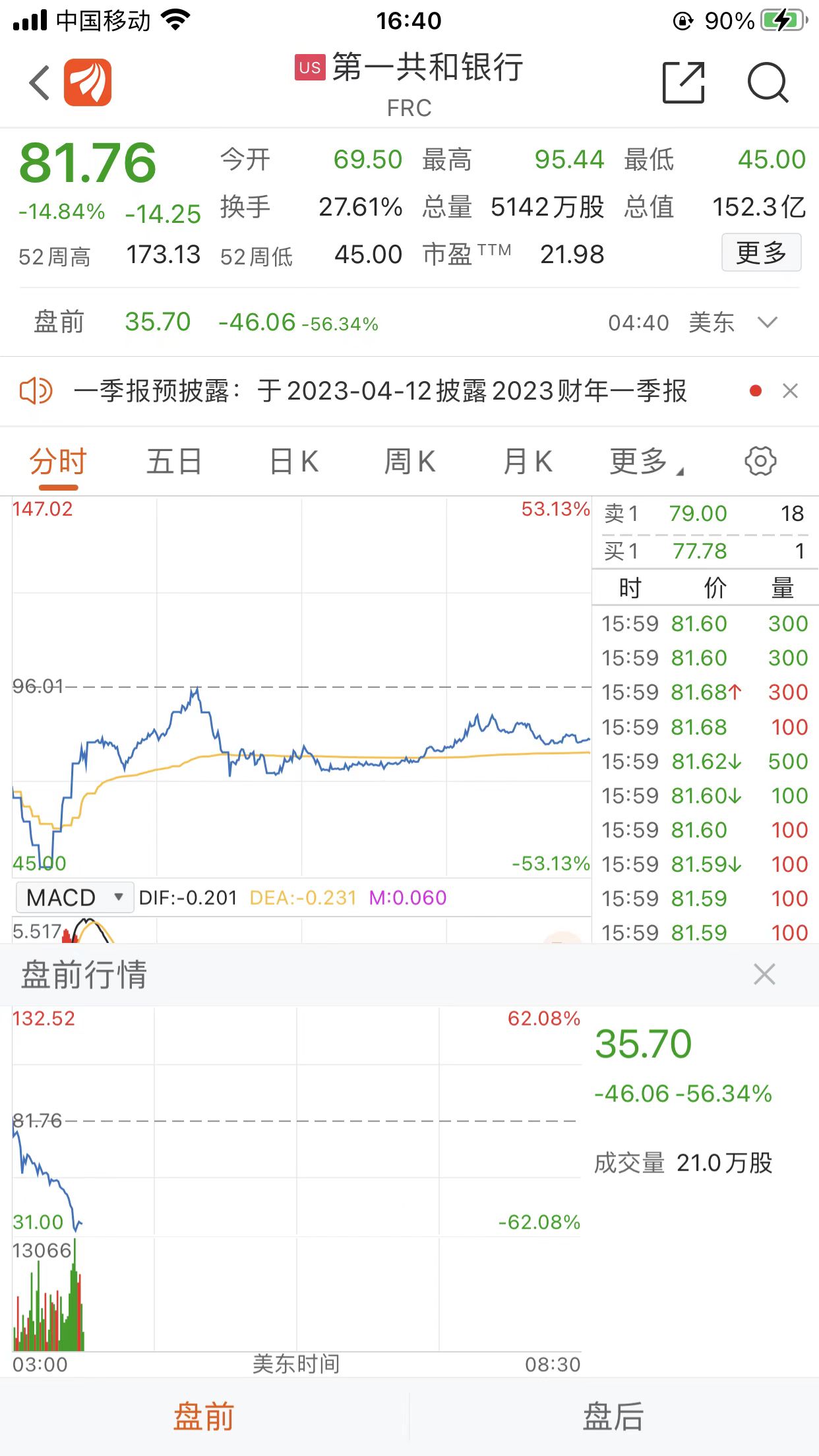 美股第一共和银行盘前暴跌 上周遭到挤兑