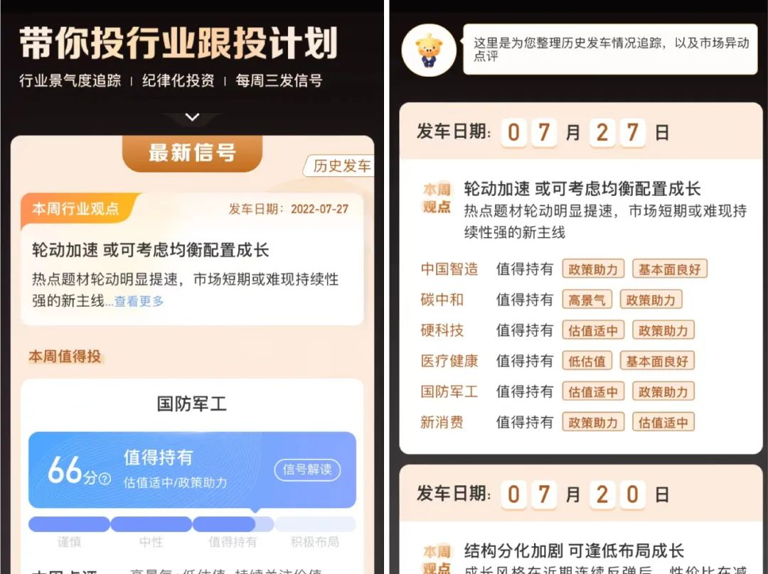 二是每周贴心的陪伴。如定投计划中的投区策略,每次更换仓库都会给出逻辑分析,定期公布运行报告。 另外,前文提到的每周发车信号,就是让投资机构将专业的投资观点、当期投资决策的基础逻辑更通俗易懂地传达给投资者,同时结合实际市场环境与大家分享投资小知识、投资心态,让大家对市场和自己的账户有一个清晰的了解