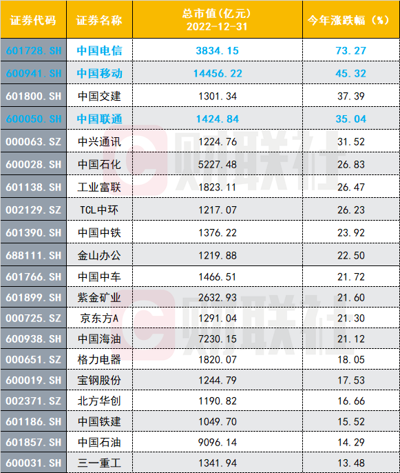 据财联社统计,截至去年年底总市值超千亿元的上市公司中,有14家公司涨幅超过20%,中字头个股占据半壁江山,而涨幅最强的莫过于三大运营商的股票。千亿市值股今年涨幅居前的5只股票,三大运营纷纷上榜,其中中国电信今年涨幅高达73%居于涨幅榜首位,中国移动涨逾45%居于次位,中国联通涨逾35%居于涨幅榜第四位。伴随着股价的大涨,三大运营商的总市值也水涨船高,今年总市值合计增超9800亿元。