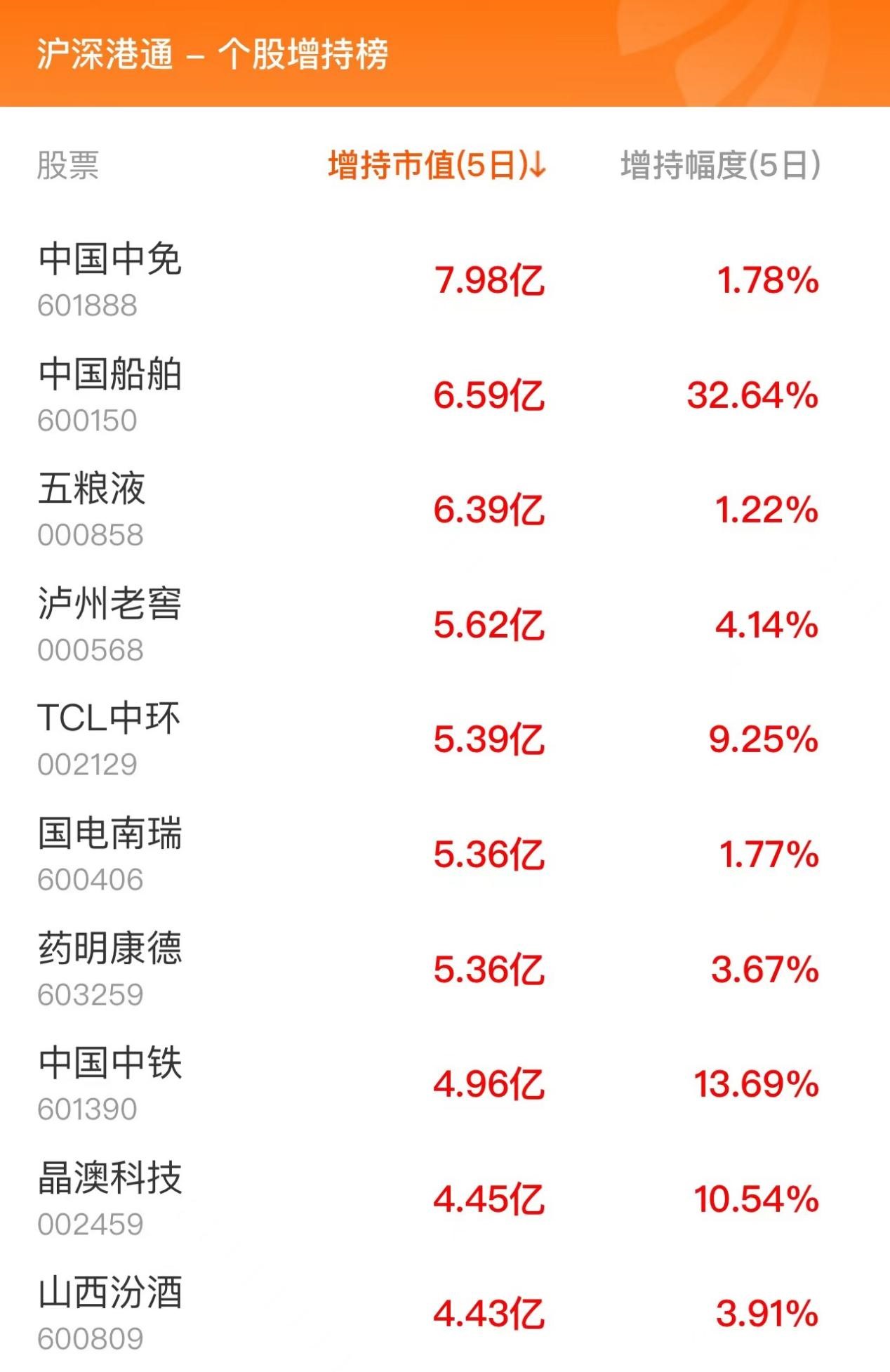 北向资金个股增持榜