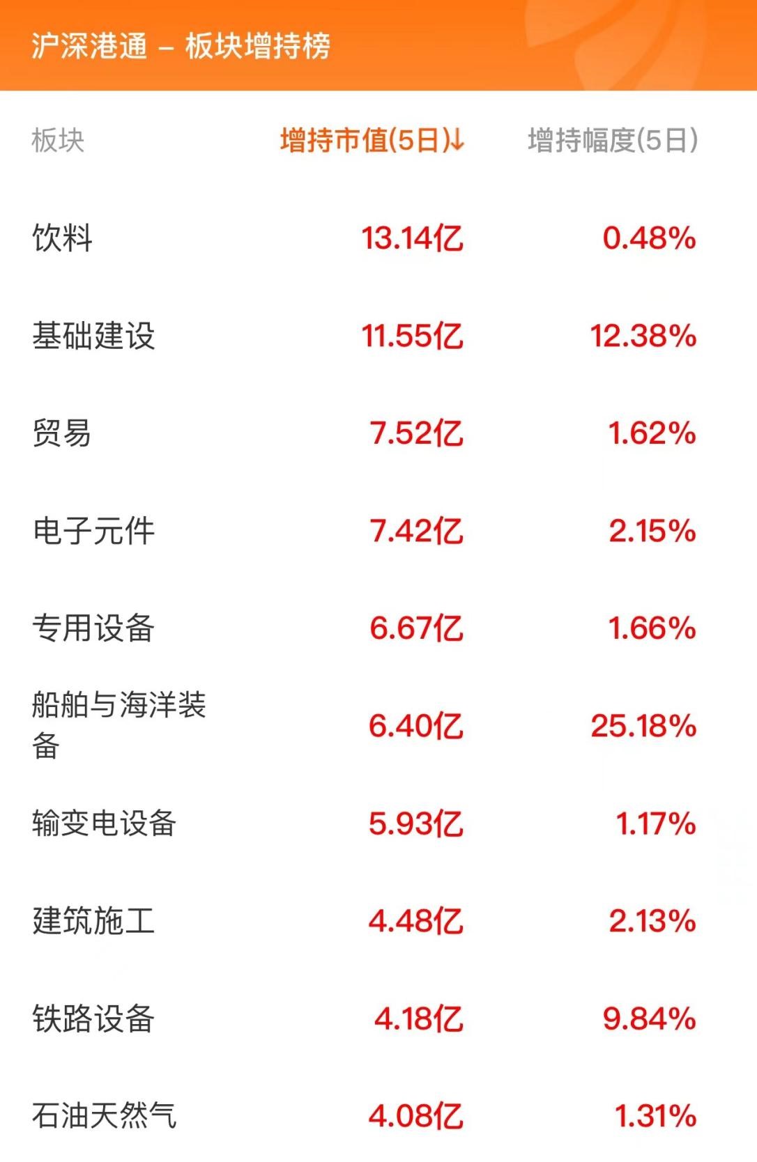 北向资金板块增持榜