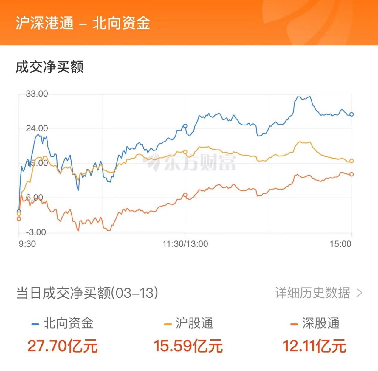 3月13日,三大指数走势分化,沪指午后震荡走高,创指全天弱势震荡。北向资金当日净买入27.7亿元,终结此前连续4日净卖出,其中,沪股通当日成交净买额15.59亿元,深股通