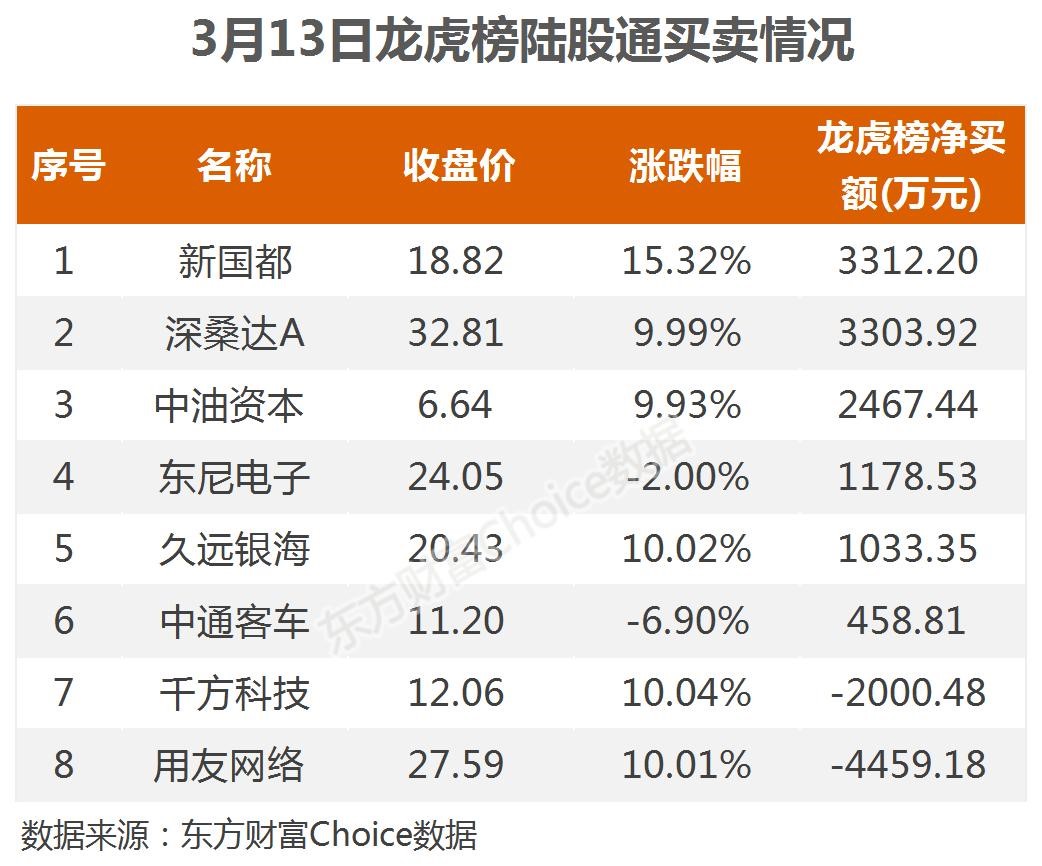 3月13日,陆股通参与龙虎榜中个股共涉及8股,其中6股被陆股通净买入,新国都被买入最多,为3312.2万元,深桑达A也被净买入3303.92万元。此外,千方科技被陆股通净卖出4459.18万元,千方科技也被净卖出2000.48万元。