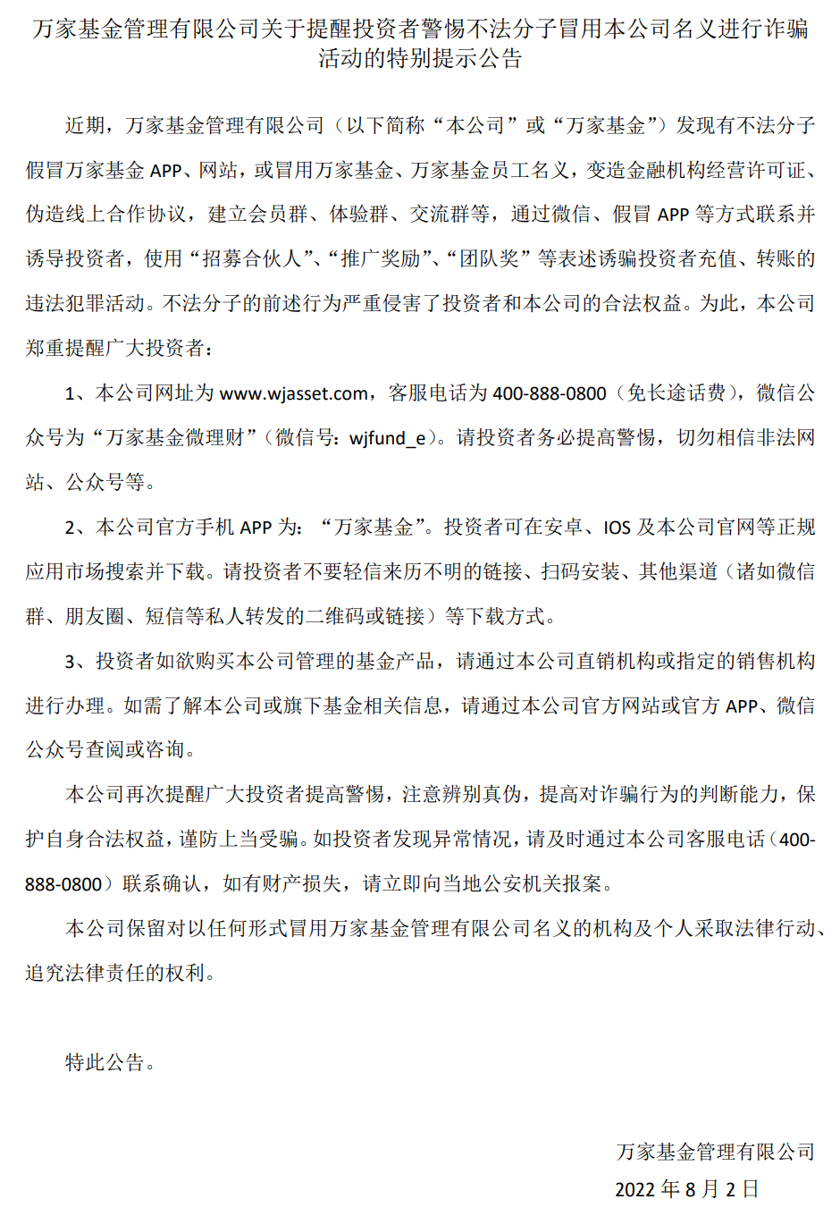 8月2日,万家基金通过不法分子假冒万家基金APP、网站,冒用万家基金、万家基金从业人员名义,改变金融机构经营许可证,伪造网上合作协议,向会员群、体验群、会员