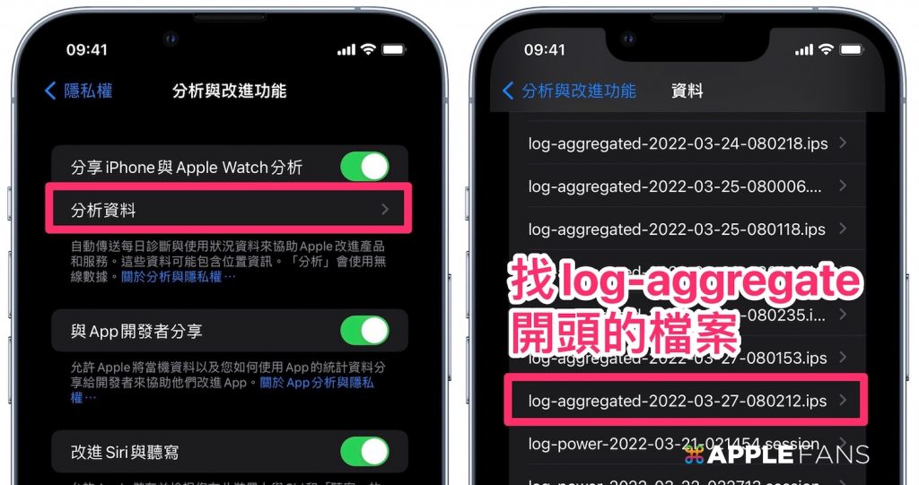 打开《设定》,同样进入“隐私权”页底部的“分析和改进功能”项,单击“分析资料”,进入后找到名称开头为「log-aggregate」最新日期的档案,然后单击。