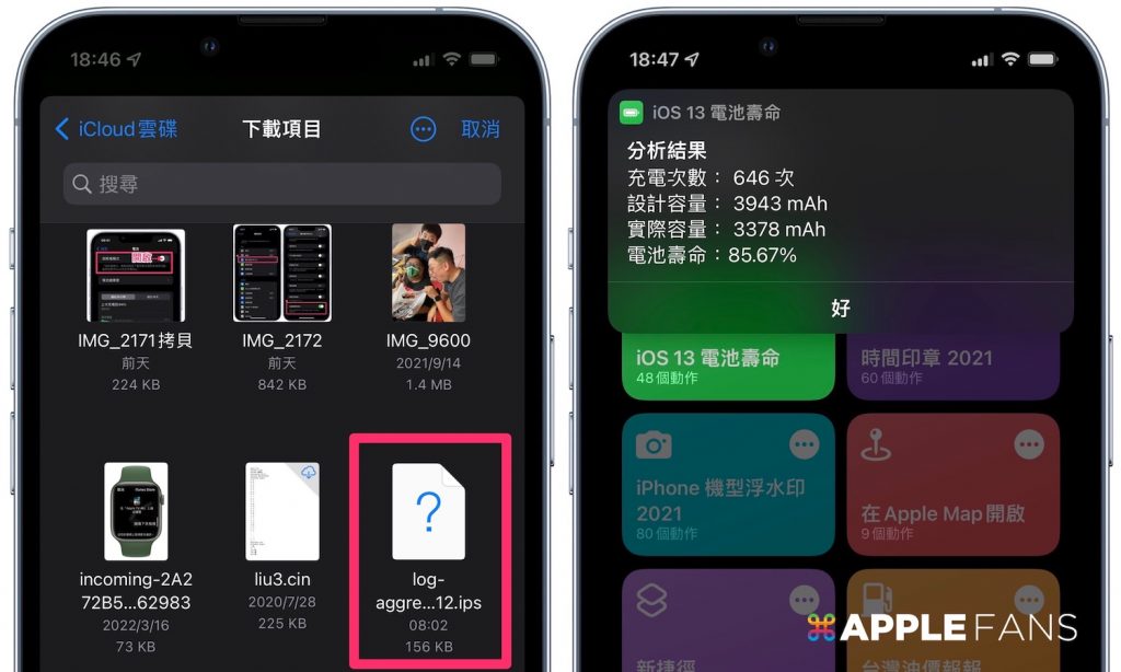 打开【快捷方式App】,点击【电池寿命】快捷方式,按刚保存的【“log-aggregate”文件】。