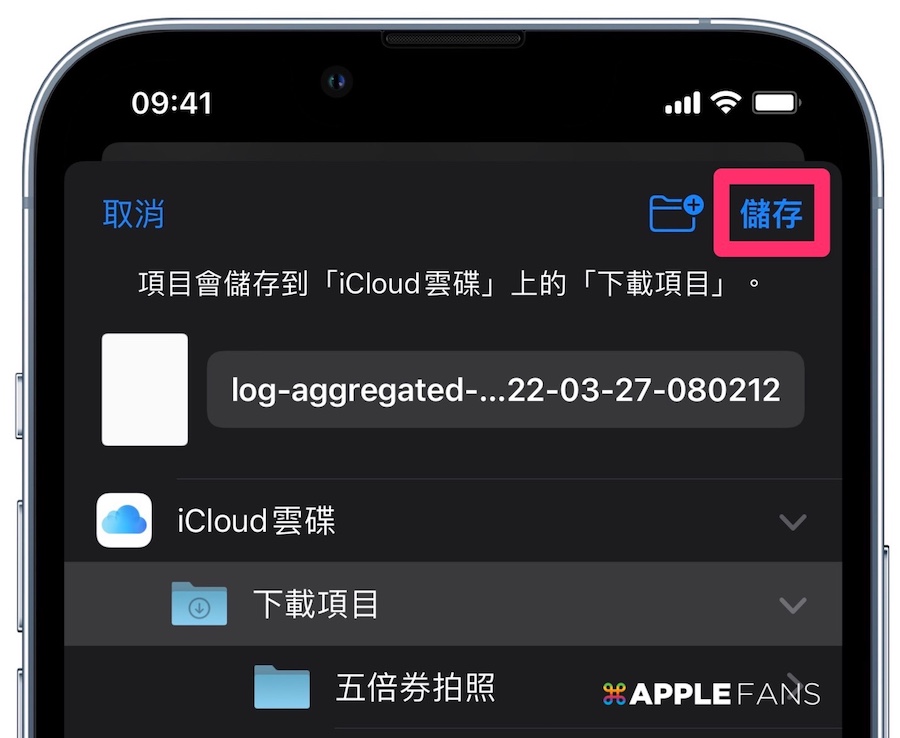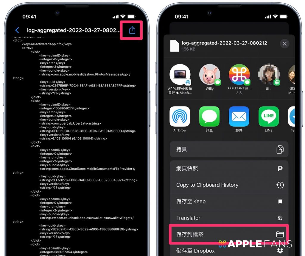 进入" log-aggregate "最新日期的文件后,直接按右上角的【共享】图标,选择【保存到文件】。