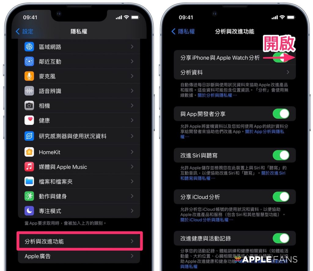 首先,打开《设定》,进入【隐私】页面底部,点击【分析和改善功能】,确认“共享iPhone分析”开关向右滑动并打开【on】。 这样就完成了基本设定。