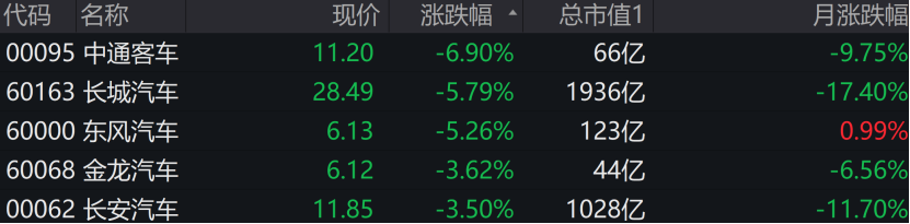 市场表现方面,3月13日,A股汽车股再次大跌,汽车(申万)指数当日下跌1.08%,中通客车下跌近7%,长城汽车、东风汽车下跌超5%。3月以来,汽车(申万)指数累计下跌7.84%,居于申万一级行业指数跌幅首位,长城汽车、江淮汽车下跌均超15%。